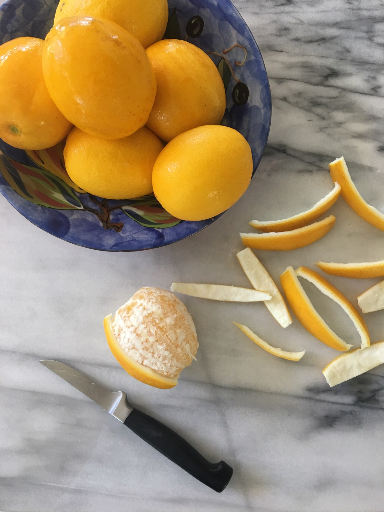 Winter in California brings citrus – lemons, oranges, tangerines and limes. This year, I am fortunate to have friends with bountiful backyards and citrus farms that have gifted me with some gorgeous lemons. So, today I shall make mostarda – which is essentially candied fruit with essence of mustard (which a friend brought me from Italy). In the summer you can use ripe cherries, pears and apricots. A bit time consuming but well worth the effort.